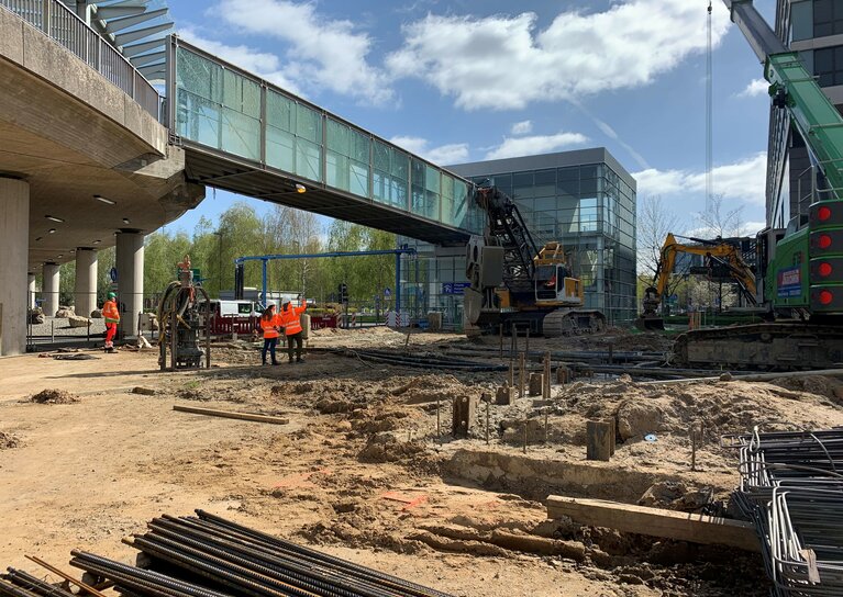 Die Arbeiten an der neuen StadtbahnlinieU81 in Düsseldorf laufen auf Hochtouren. So konnte diese Woche die Baugrubenumschließung der Haltestelle Flughafen Terminal in Schlitzwand-Bauweise abgeschlossen werden. Das unterirdische Bauwerk des U-Bahnhofes ist rund 182 Meter lang und befindet sich unter der Ankunftsebene der zukünftigen Flughafenbebauung. Durch die zum Teil stark beengten Platzverhältnisse, stellte der Verbau der ca. 11.500 m² Schlitzwand eine herausfordernde Aufgabe dar. Die kommenden Maßnahmen sind unter anderem der Aushub der Baugrube für die Haltestelle, sowie die Baugrubenumschließung des Streckentunnels und Rampenbauwerks, welche die U81 an die Oberfläche führen. Die Rohbauarbeiten werden im Rahmen der Bauüberwachung durch die Vössing Ingenieure begleitet.