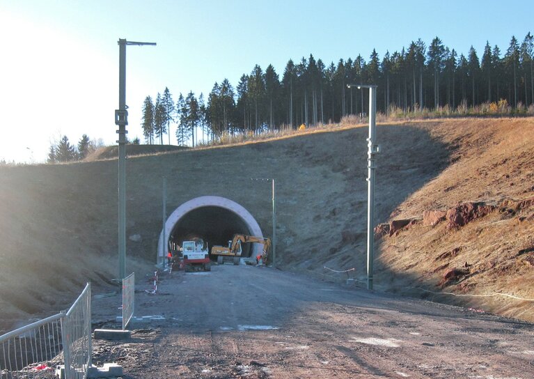 Auch der 688 m lange Lohmebergtunnel unterfährt weitgehend Forstflächen. Beide Tunnel wurden im Spreng- bzw. Baggervortrieb mit anschließender Spritzbeton-Sicherung hergestellt und zweischalig ausgebaut.