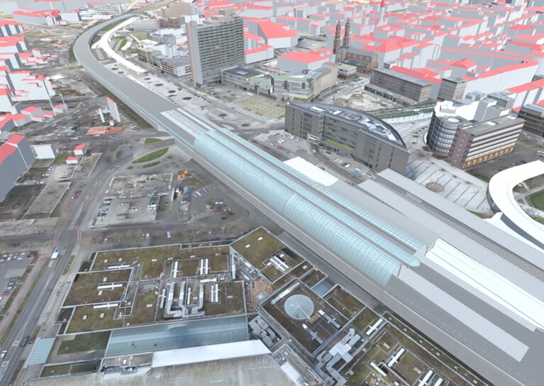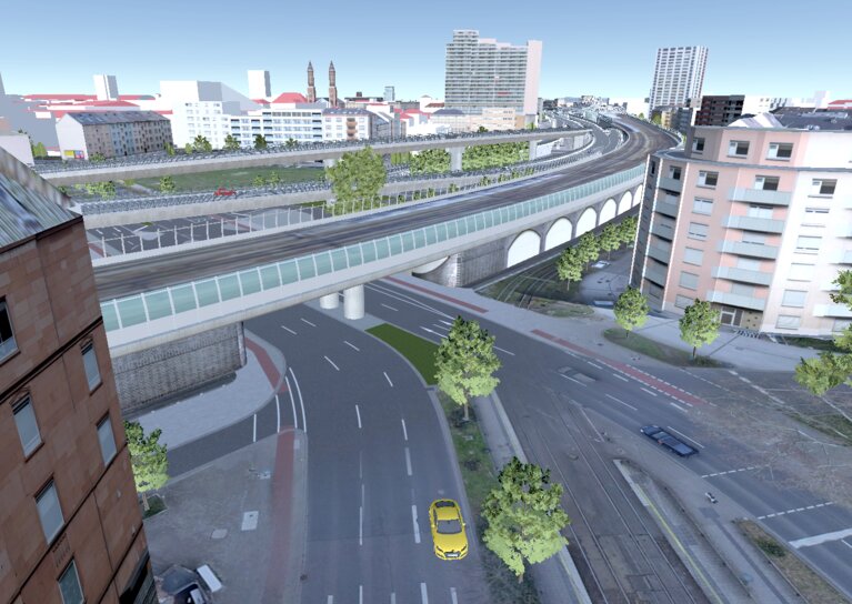 Im Rahmen der Öffentlichkeitsarbeit sollen Visualisierungen für die Varianten der Vorplanung sowie der Vorzugsvariante der Entwurfsplanung erstellt werden. Die Visualisierungen sollen als 3D-Echtzeitbetrachter umgesetzt werden. Dabei sollen mögliche Varianten umschaltbar sein und fließender Verkehr simuliert werden.